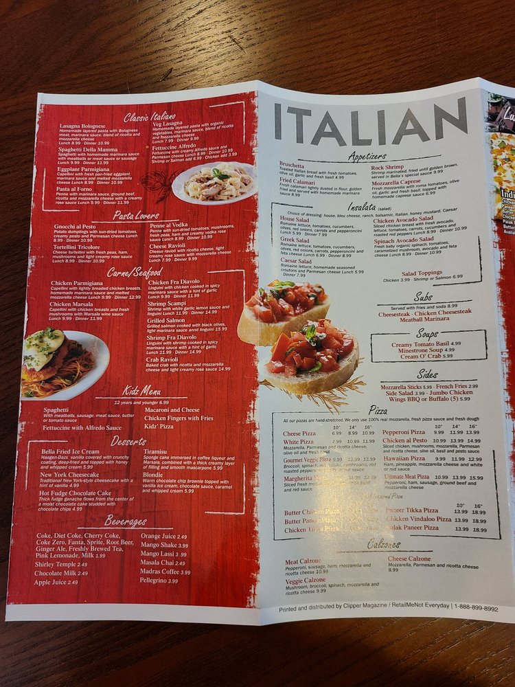 Bella Indian & Italian Cuisine offers a unique fusion of Indian and Italian dishes, combining flavors from both cuisines. The menu includes a variety of Indian appetizers, soups, and chicken dishes, such as Chicken Tikka Masala and Butter Chicken. Customers praise the flavorful dishes, with particular highlights being the Butter Chicken pizza, Chicken Tikka calzone, and Lamb Vindaloo pizza. The restaurant provides a cozy dining experience, with friendly staff and a clean environment. Many customers return regularly for the delicious food and generous portion sizes. Bella Indian & Italian Cuisine is a hidden gem in Laurel, MD, offering a diverse menu with options for vegetarians and vegans. Don't miss out on trying their unique Indian-Italian fusion dishes!